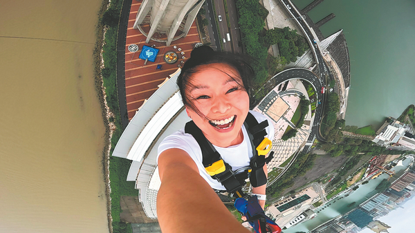 Kara Schroeder swings above the ground at the Macao Tower bungee jump.KARA SCHROEDER/CHINA DAILY